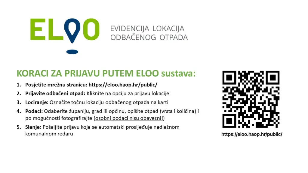 Na raspolaganju nam je ELOO (Evidencija lokacija odbačenog otpada), službeni sustav Ministarstva zaštite okoliša i zelene tranzicije, preko kojeg brzo i jednostavno možete prijaviti mjesta na kojima ste uočili nepropisno odbačen otpad ili smeće u prirodi.